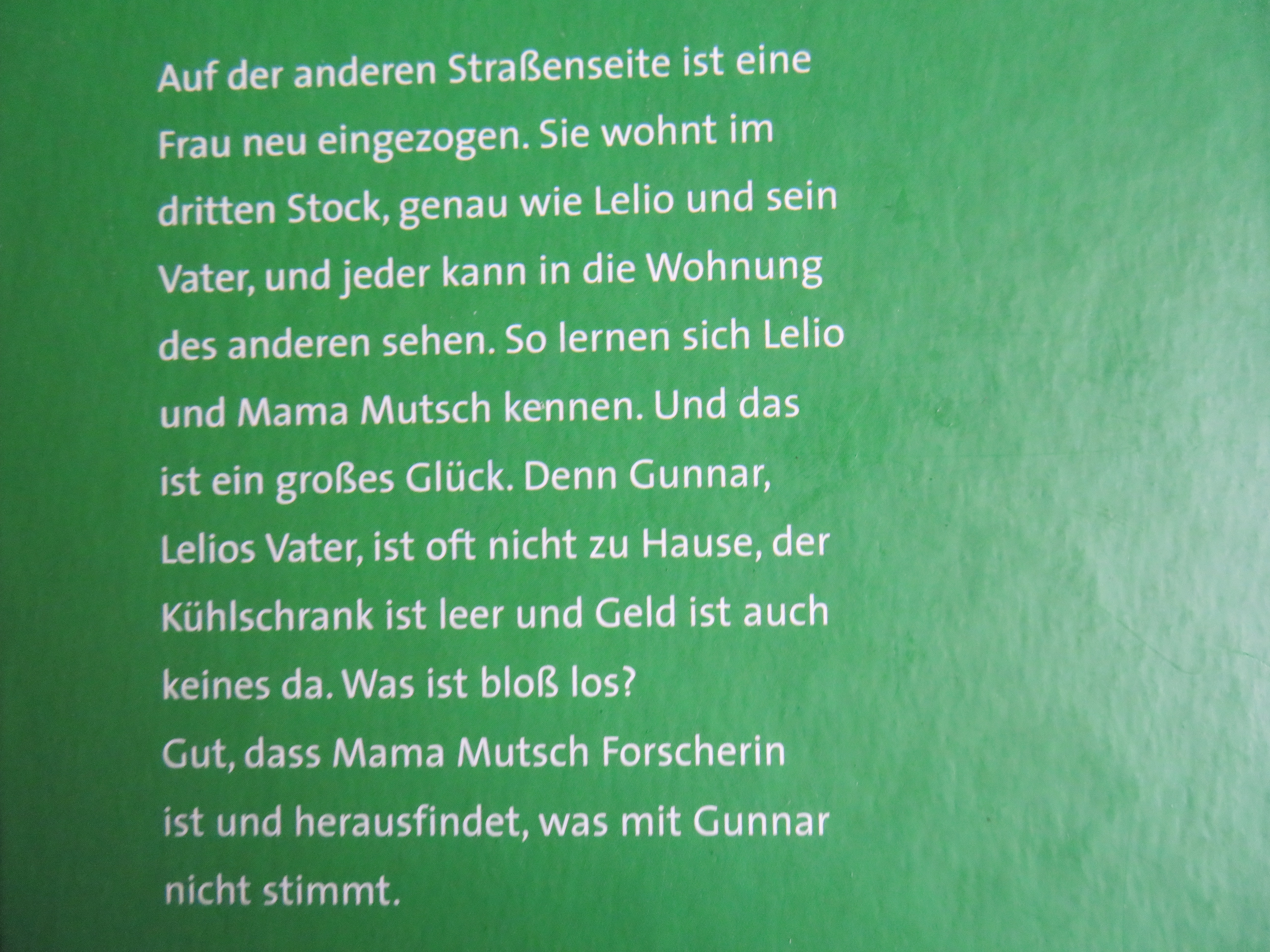 Meine Söhne und ich waren sehr beeindruckt von diesem gleichermaßen schönen und bedrückenden Buch. Als (Vor-)Leser empfanden wir Mitleid, aber auch Bewunderung für Lelio, der sich nicht unterkriegen lässt. Wir freuten uns mit ihm über schöne Momente. Im Angesicht der wachsenden Freundschaft mit "Mama Mutsch", die eigentlich ganz anders heißt,